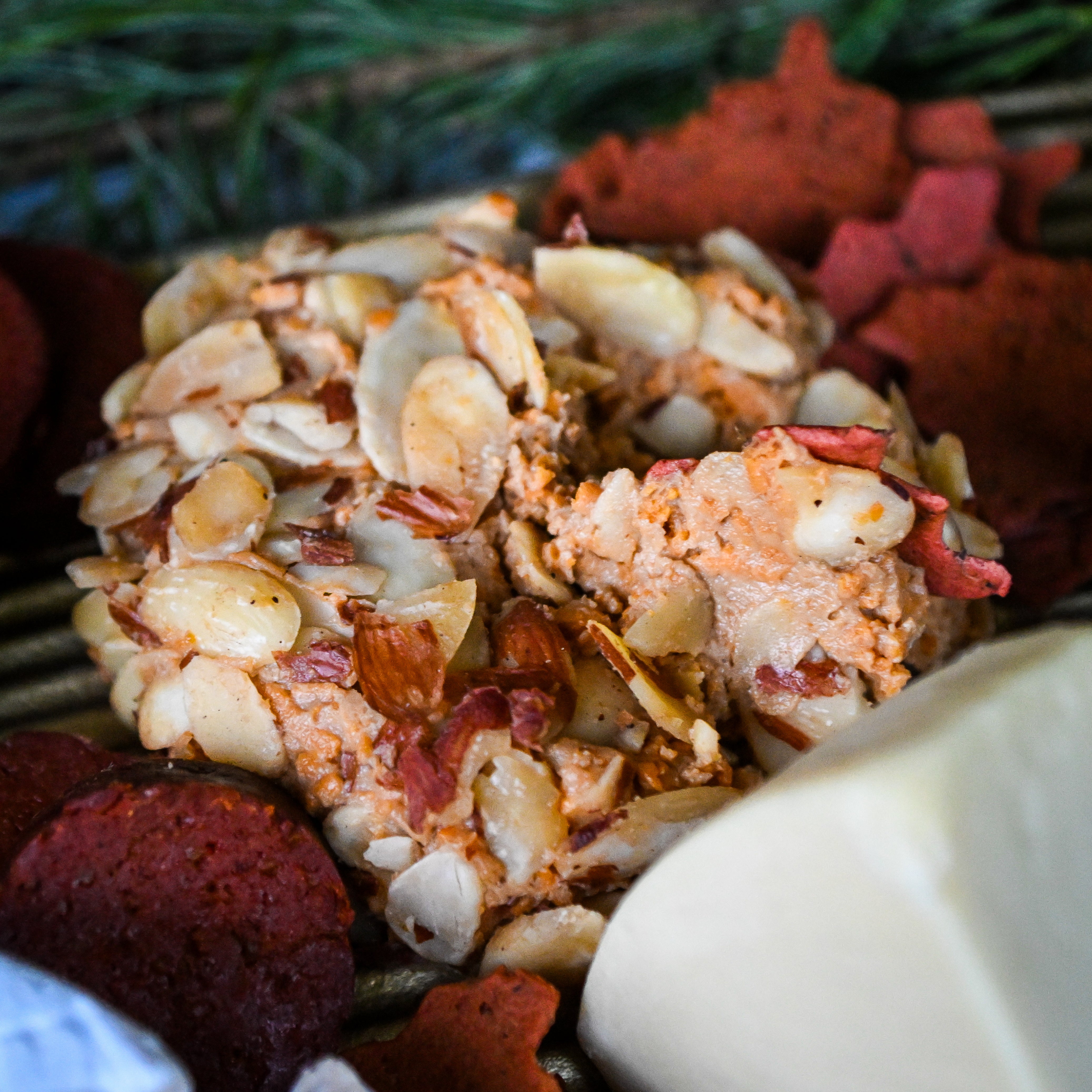 An assortment of crackers, dried fruit, vegan sausage, olives, mustard, and jams to pair with your cheeses. Contains gluten.